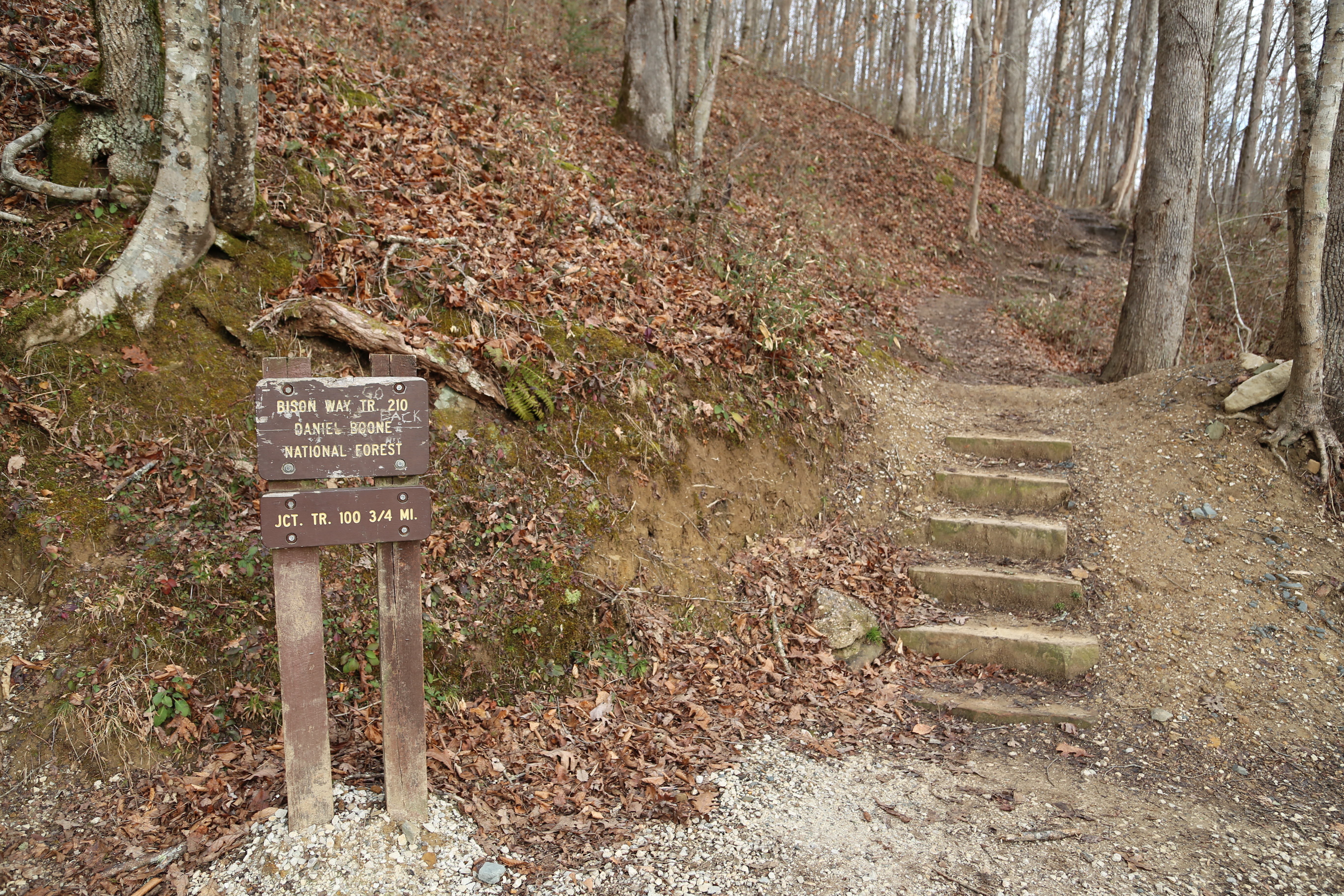 There are several ways to access Indian Staircase if you know the unofficial trails. We chose to park at the Bison Way trailhead along KY-715, near the Gladie Learning Center. We hiked the Bison Way Trail (#210) to the Sheltowee Trace (#100) and followed that west to the unofficial, unmarked approach trail to Indian Staircase. The approach trail is well traveled so it is not too difficult to find the cutoff or follow the trail itself.